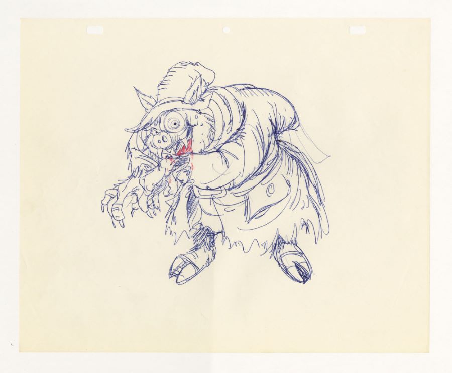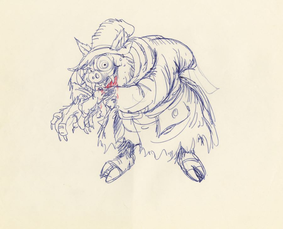 A design sketch from an unkown Ralph Bakshi Studios animated film (c.1970/80s). Featuring a terrifying pig-like creature, the design sketch was created at the studio and used during the character development process. Measuring 10.5"x12.5" overall and with the character image measuring 7"x7.5", the sketch is in very good condition with minimal edge wear.